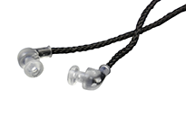 Replacement Pop-In Cord for Custom Earplugs. Available in black nylon (left) or clear plastic (right). Includes Shirt Clip to keep cord secure.